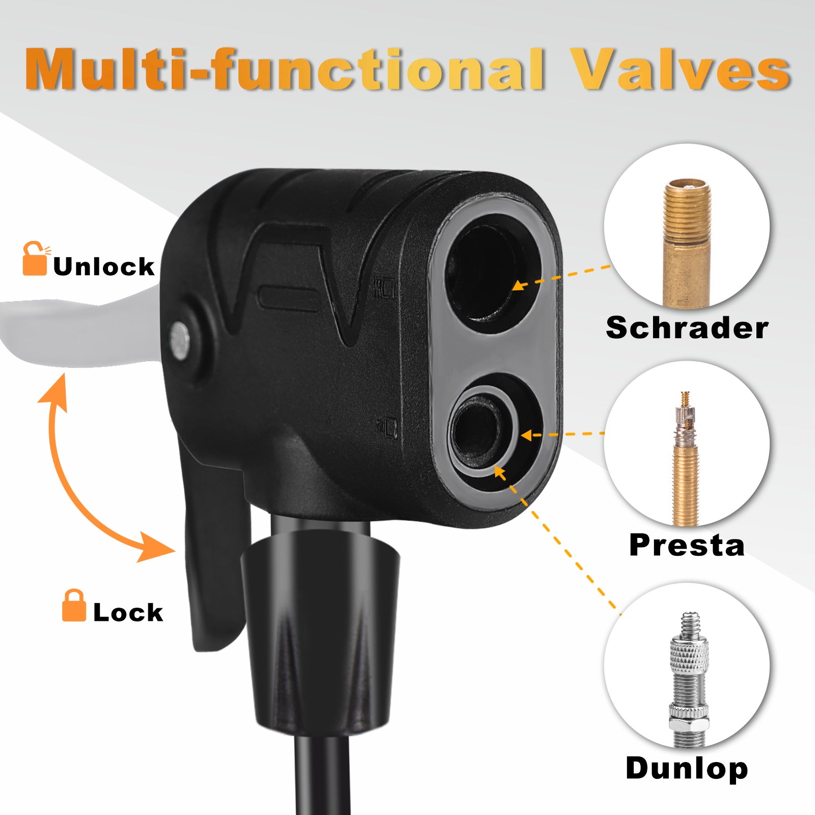 【3 Valves Compatible with Various Bikes】This bike tire pump features a single valve that fits both Presta and Schrader valves and includes a separate Dunlop valve adapter. The bike air pump is compatible with a wide range of bikes including BMX, MTB, road bikes, commuter bikes, Japanese Mama Chari (city bikes), as well as electric bicycles and motorcycles.
