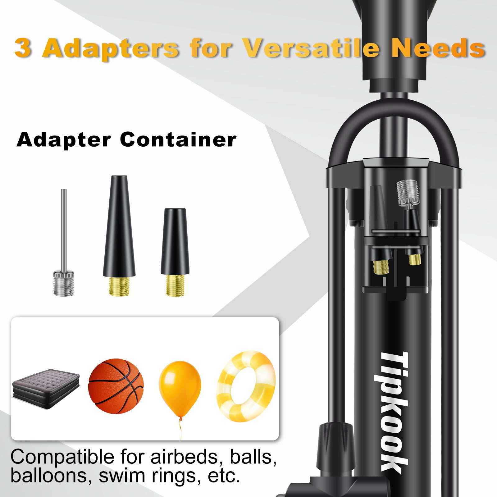 【3 Adapters Suitable for Daily Applications】The bike pump also comes with 3 adapters stored in a container attached to the barrel, which are easy to storage and access. The needle adapter inflates balls such as footballs, basketballs and rugby balls. The other two adapters, wide and narrow cone, can handle more daily inflation tasks such as airbeds, floats, and inflatable toys.