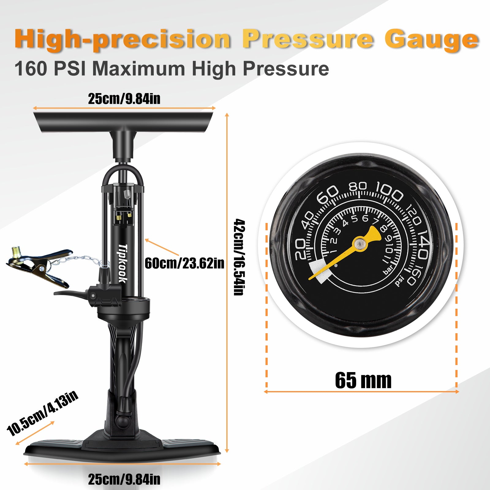 【160 PSI Precise Pressure Gauge】The bike pump with gauge reaches up to 160 PSI/11 Bar, ideal for various applications, including professional tires with high pressure demand. The high-pressure capacity also allows you to reach your desired pressure in fewer strokes and less effort. The pressure gauge displays precisely after connection, enabling you to easily and clearly monitor the exact pressure to control the inflation and check for potential leaks.