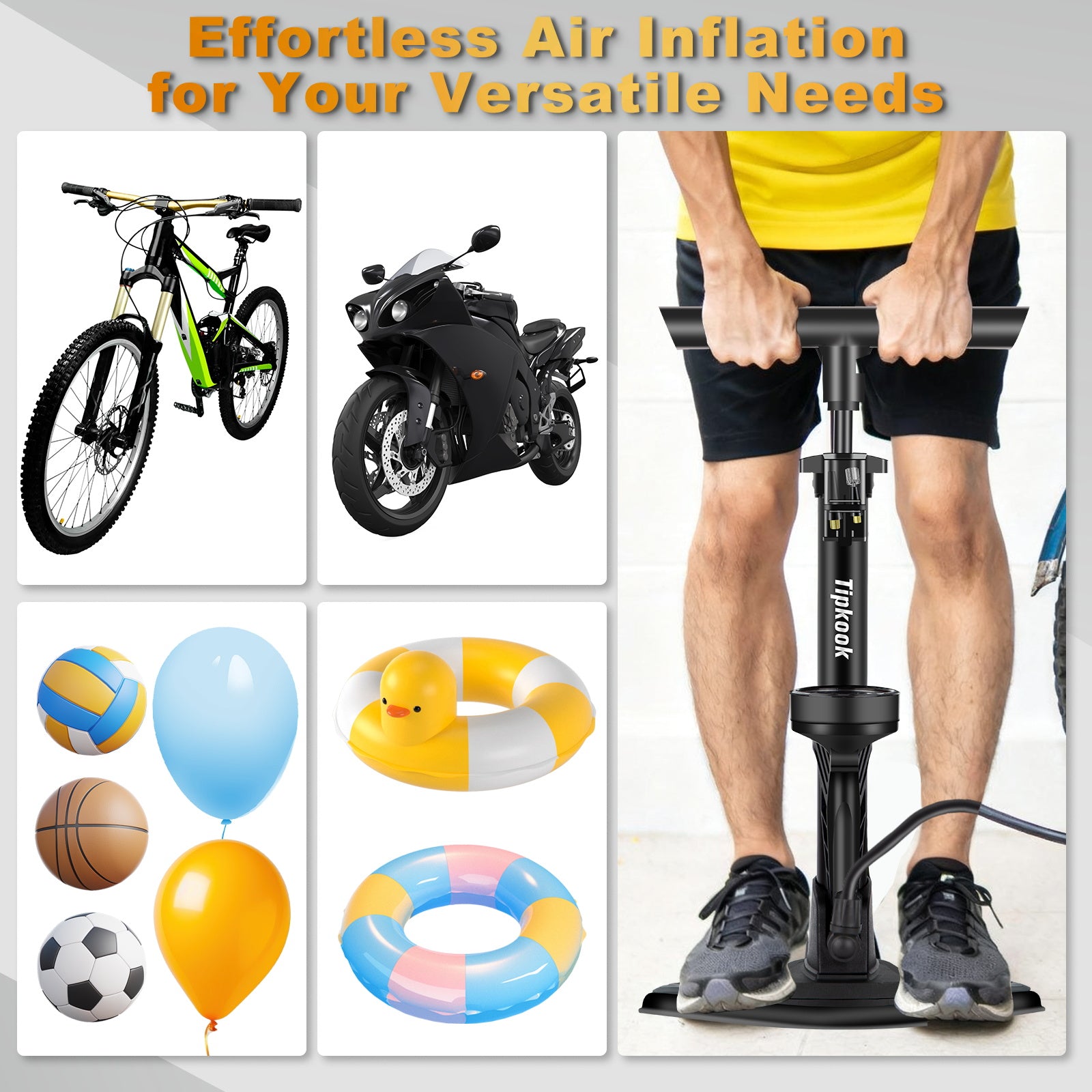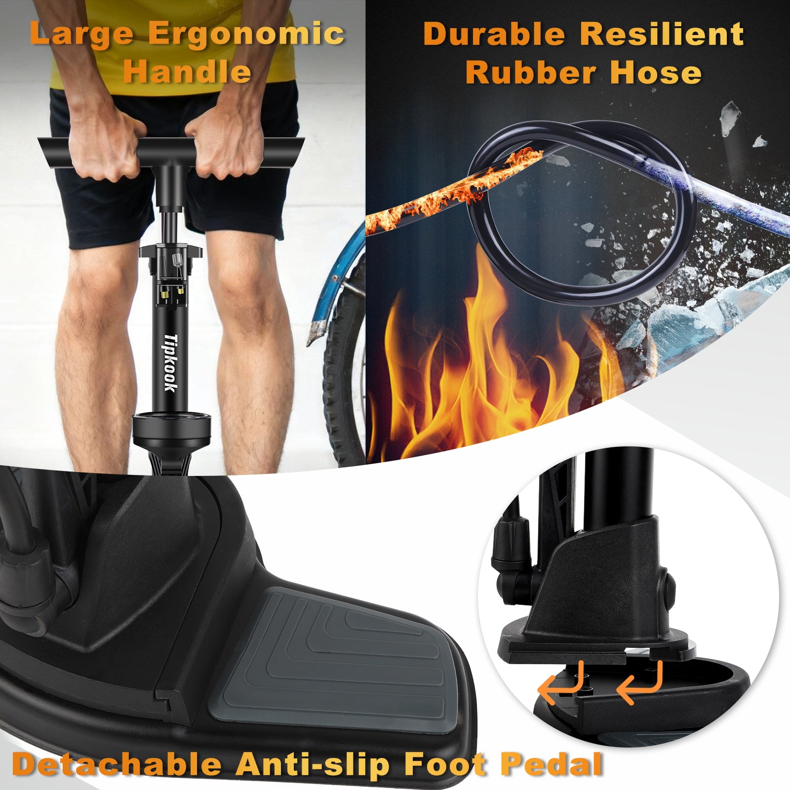【Convenient to Use with Detachable Non-slip Base】The portable bike pump features a detachable foot pedal for steadier inflation and enhanced portability. Its non-slip rubber pad at the bottom increases its stability even on slippery or uneven ground. You just need to attach the foot pedal, step on it and you can begin inflating. The T-shape ergonomic handle requires less effort. Designed for easy and efficient inflation, the bike tire pump is suitable for users of all ages.